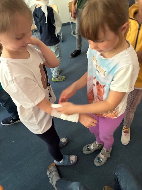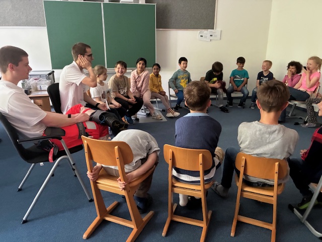 In der Woche vom 2. Juni bis zum 5. Juni 2025 durften die Erst- und Zweitklasskinder einen 1. Hilfe-Kurs besuchen. Kindgemäß, interaktiv, anschaulich und professionell wurden die Schülerinnen und Schüler in Themen der 1. Hilfe eingeführt. Sie lernten den Erste-Hilfe-Kasten und das richtige Verhalten bei Unfällen kennen, empfanden Unfälle in Rollenspielen nach und verarzteten sich gegenseitig mit Pflastern und Verbänden. Alle Fragen wurden umsichtig beantwortet. Auch der Werdegang zur Ersthelferin bzw. zum Ersthelfer wurde thematisiert. Vielen Dank an die Referenten Felix Reichelt und Lukas Dürmeier für die anschauliche und interessante 1. Hilfe-Ausbildung!