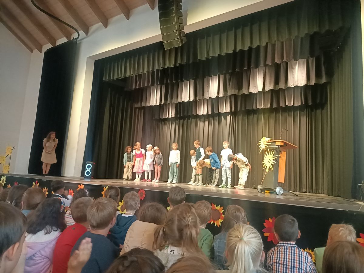 Mit dem Start ins neue Schuljahr 2025/2026 versammelten sich nach einem ökomenischen Gottesdienst in der Katholischen Pfarrkirche über 90 neue Erstklässlerinnen und Erstklässler voller Freude und Neugier mit ihren Eltern und weiteren Gästen sowie wunderschön gestalteten Schultüten im Bürgersaal. Dort fand die feierliche Schuleingangsfeier statt und die neuen Kinder wurden von den Zweitklässlern, ihren neuen Lehrerinnen und der Schulleitung empfangen und herzlich willkommen geheißen. Mit einem bunten Programm aus einer Geschichte und mehreren Darbietungen der Klassen wurden die Schulanfängerinnen und Schulanfänger begrüßt und gefeiert. So führten zwei Klassen einen Begrüßungsrap und eine zweite Klasse ein Lied auf. Alle Viertklässler trugen mit dem Cup-Song und guten Wünschen für die Erstklasskinder zu einer gelungenen Feier bei.