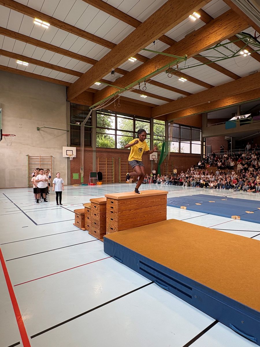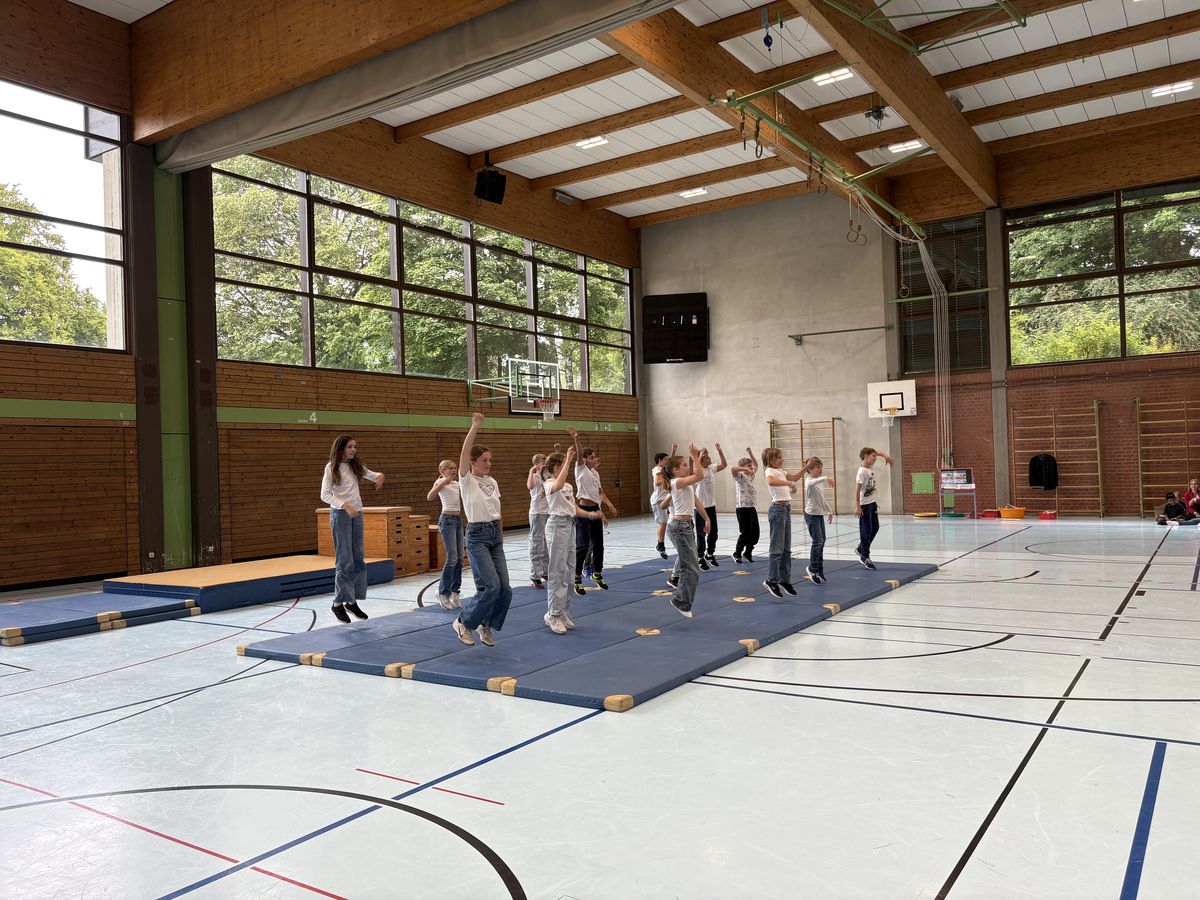 Danach hatten die dritten und vierten Klassen zahlreiche Beiträge einstudiert. So führten die Kinder ein Lied, einen Tanz, ein Theaterstück und mehrere Akrobatikchoreografien auf. Mit einem Sprung über vier Kästen als Symbol für die erste, zweite, dritte und vierte Jahrgangsstufe durften die Schülerinnen und Schüler der vierten Klassen anschaulich in ihre Zukunft springen und sich von ihrer Lehrerin bzw. ihrem Lehrer und der Schulleitung verabschieden. Am Ende der feierlichen Veranstaltung wurden die Viertklässlerinnen und Viertklässler von den anderen Kindern am Ausgang der Turnhalle mit einem Spalier verabschiedet.