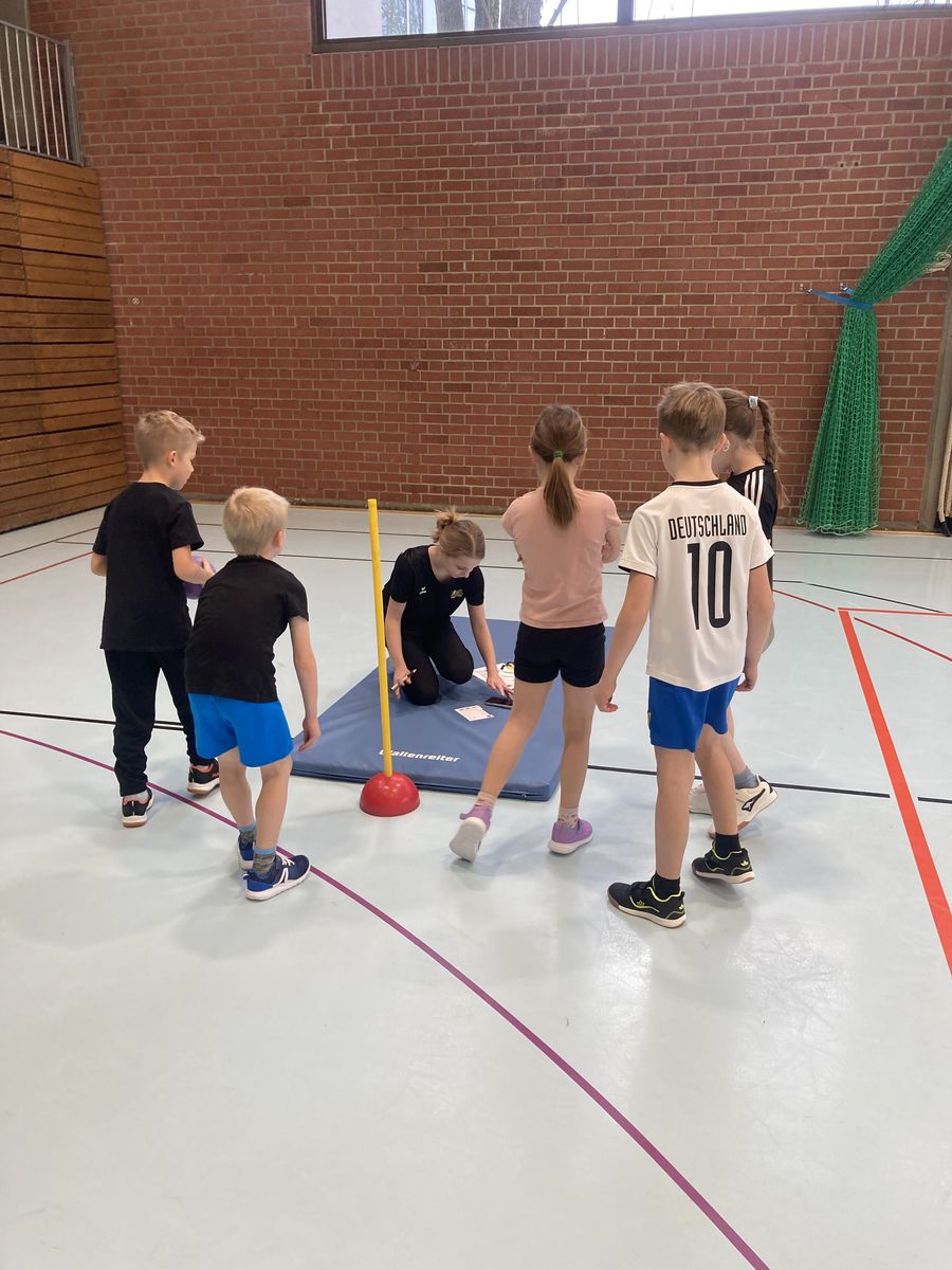 Es gab fünf Stationen: „WERFEN UND FANGEN“, „HOCHWERFEN“, „LAUFEN“, „ZIELWERFEN“ und „PRELLEN“. An jeder Station hatten die Kinder eine andere sportliche Aufgabe, die in Gruppen absolviert wurde. So konnten unsere kleinen Sportlerinnen und Sportler ihre Geschicklichkeit und ihr Ballgefühl unter Beweis stellen. Am Ende erhielten sie je nach Anzahl ihrer Punkte einen Aufkleber, der den Gold-, Silber- oder Bronzerang markierte. Die Kinder hatten sehr viel Freude und nahmen mit großem Engagement und viel Motivation an dem Stationentraining teil.
