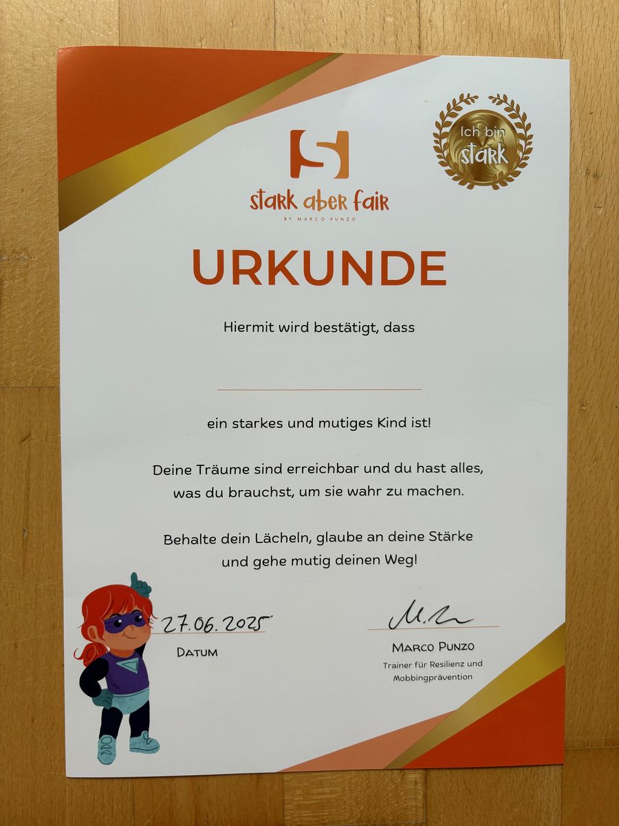 Ende Juni 2025 nahmen unsere dritten Klassen an dem Projekt „Stark aber fair“ teil. Geleitet wurde das Kindertraining „Mobbingprävention & Lebenskompetenz“ von Herrn Marco Punzo, Trainer für Resilienz und Mobbingprävention. Das Konzept hatte u. a. das Ziel, die persönliche Entwicklung der Kinder zu unterstützen und das Selbstbewusstsein zu stärken. In den Trainingsinhalten lernten die Schülerinnen und Schüler spiel- und bewegungsorientiert, kommunikativ und kindgemäß den Umgang mit Mobbingsituationen und anderen Alltagsherausforderungen. Der Trainer leitete die Kinder in seinen Einheiten dazu an, Konflikte gewaltfrei und eigenständig zu lösen.