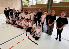 Danach hatten die dritten und vierten Klassen zahlreiche Beiträge einstudiert. So führten die Kinder ein Lied, einen Tanz, ein Theaterstück und mehrere Akrobatikchoreografien auf. Mit einem Sprung über vier Kästen als Symbol für die erste, zweite, dritte und vierte Jahrgangsstufe durften die Schülerinnen und Schüler der vierten Klassen anschaulich in ihre Zukunft springen und sich von ihrer Lehrerin bzw. ihrem Lehrer und der Schulleitung verabschieden. Am Ende der feierlichen Veranstaltung wurden die Viertklässlerinnen und Viertklässler von den anderen Kindern am Ausgang der Turnhalle mit einem Spalier verabschiedet.